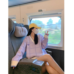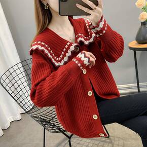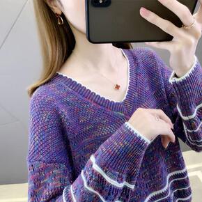 2021年秋季新款宽松撞色小清新 V领毛衣女慵懒风...