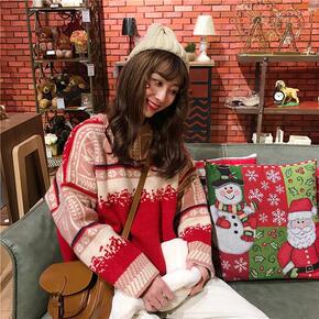2021秋冬新款慵懒风圣诞节宽松套头毛衣女韩版甜美...