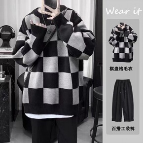 包邮暗黑棋盘格慵懒风毛衣男加厚针织衫秋冬款潮流宽松...