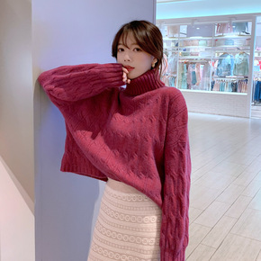 好质量2022春秋韩版女装宽松慵懒风纯色麻花高领毛...
