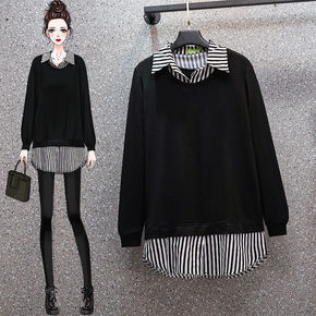 大码女装拼接假两件套头毛衣秋季胖妹妹宽松显瘦慵懒风...