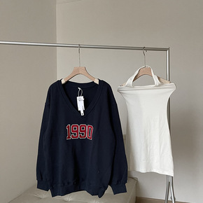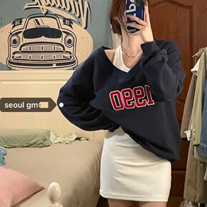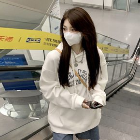 韩系chic复古洋气减龄卫衣v领慵懒风套头露肩上衣...