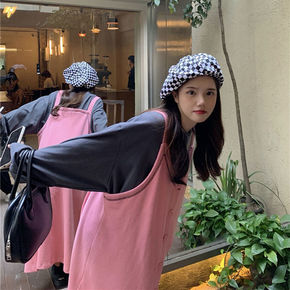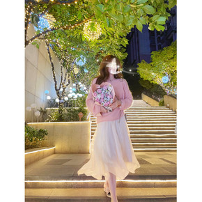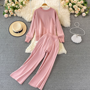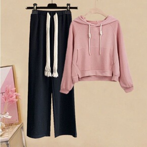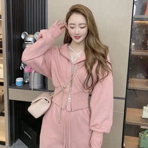 小个子秋冬季长袖短款慵懒粉色上衣套装2021网红编...