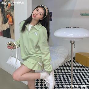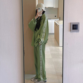 绿色炸街运动套装女春秋季韩版宽松显瘦学生慵懒卫衣休...