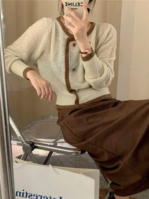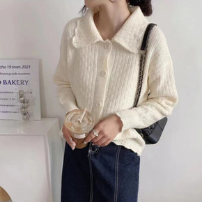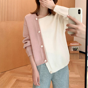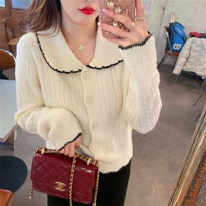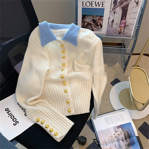 拼色娃娃领毛衣外套女金色纽扣收腰慵懒针织开衫韩版洋...