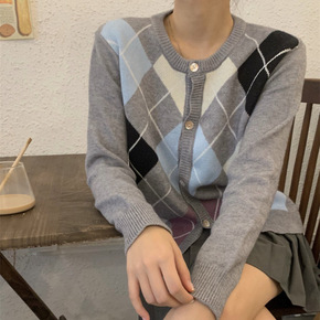 复古菱格短款针织开衫女2022秋季新款宽松韩版慵懒...