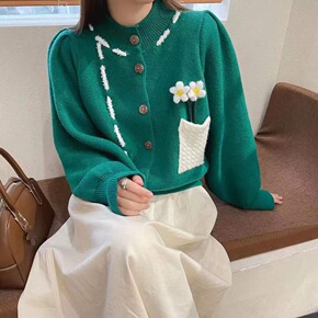 韩版立体口袋花朵设计甜美减龄气质单排扣开衫慵懒风2...