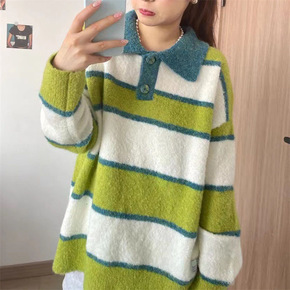 复古休闲撞色条纹Polo领针织套头毛衣女学院风外套...