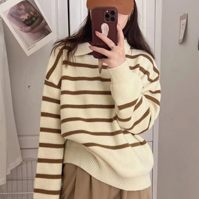 百搭Polo领慵懒风减龄条纹毛衣外套女2022秋冬...