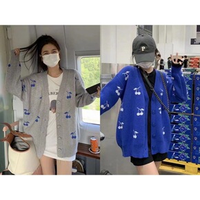 2022年新款宽松v领撞色针织开衫外套女春秋薄款外...