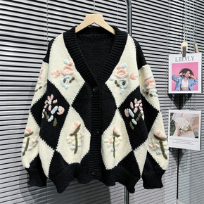 毛衣日系慵懒复古菱格开衫女2022秋冬新款宽松重工...