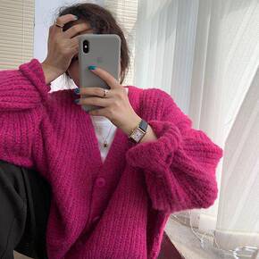 纯色V领粗针单排扣针织开衫2022春秋新款宽松简约...