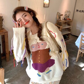 2021秋冬新款复古法式慵懒风白色套头毛衣宽松设计...
