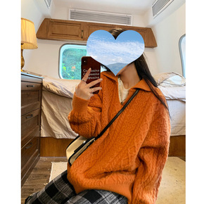 桔色半开领麻花毛衣女2021冬季新款宽松韩版慵懒风...