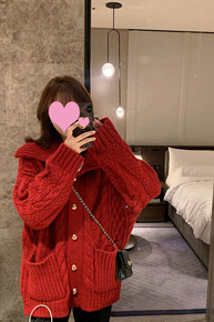 圣诞新年大红色毛衣外套女秋冬2021年爆款宽松慵懒...