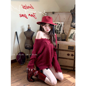 2021年秋冬季新款微胖大码V领红色软糯慵懒风设计...