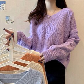 韩版纯色麻花圆领套头毛衣女2021秋冬新款宽松长袖...