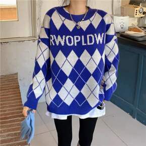 2022春秋冬菱形格毛衣女秋冬宽松慵懒风针织衫潮牌...