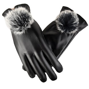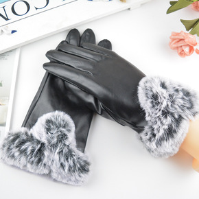 女士大毛口V型触屏保暖加绒手套冬季骑行时尚皮手套厂...
