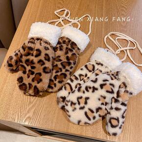 冬季女士豹纹手套 ins日系学生户外加绒加厚包指头...
