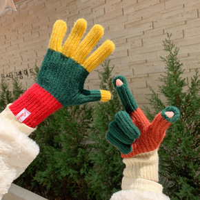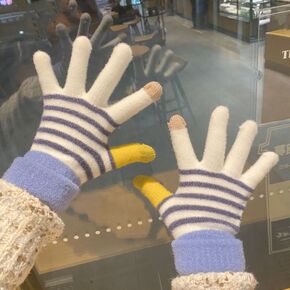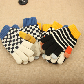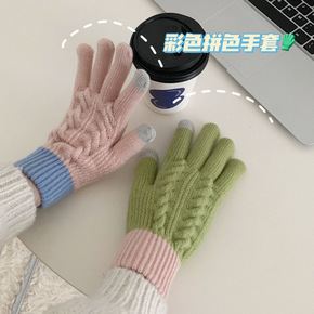 新款情侣手套女冬季保暖可爱毛线拼色条纹触屏网红防寒...
