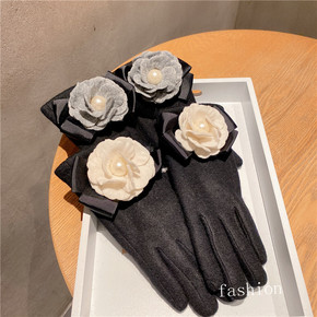 小香风山茶花羊绒分指手套秋冬保暖加绒加厚骑车开车冷...