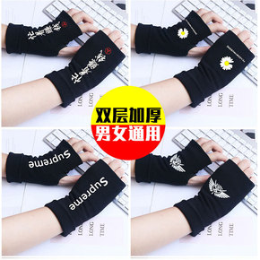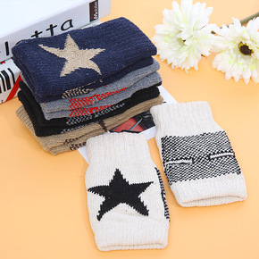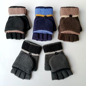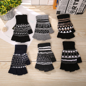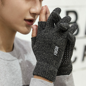 男士冬季针织保暖半指翻盖手套 学生写字半截毛线手套...