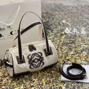 2021秋冬新款罗意帆布波斯顿圆桶包牛皮手提单肩斜...