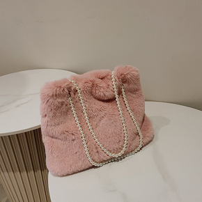 毛绒包包女斜跨手提公主包仿皮草毛绒托特包新款珍珠链...