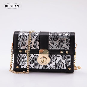 新款蛇纹PU皮盒子单肩包复古锁扣女包箱子网红链条包...