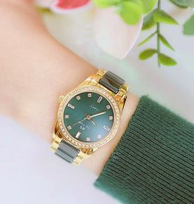 BS新款热销手表厂家直销外贸链表复古绿标陶瓷水钻一...