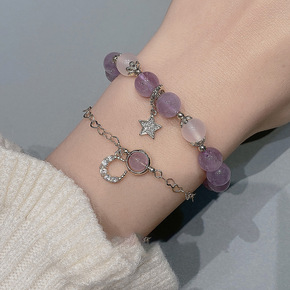 HUCU紫水晶手链女ins小众设计粉晶925银手串...