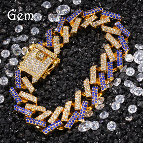跨境热卖嘻哈古巴链15mm金色满钻条形男士手链hi...