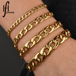 亚马逊男式光面不锈钢古巴手链 简约金色潮人配饰手镯...