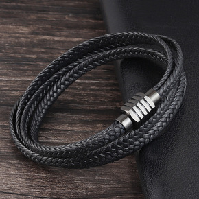 黑色牛皮手链 男士多层不锈钢真皮编织手链 手工皮革...