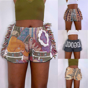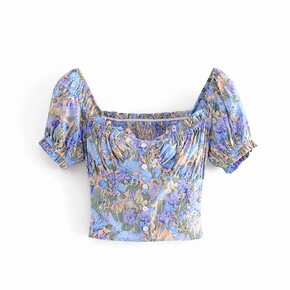 厂家现货露脐单排扣时尚复古法式水墨印花泡泡袖娃娃衫...