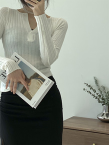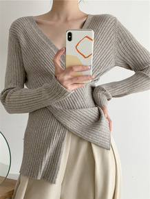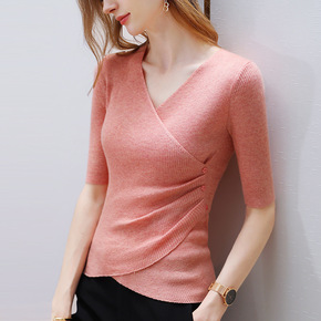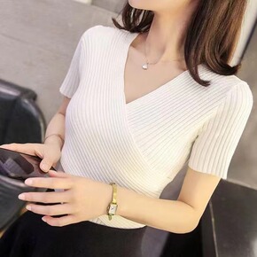 2022春季新款韩国东大门竖条纹螺纹法式v领性感羊...