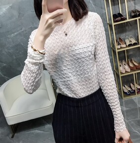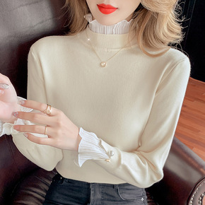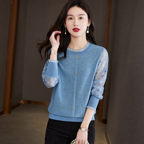 2022秋冬新款韩版气质拼接蕾丝纯色长袖上衣服修身...