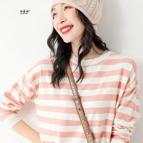 羊毛混纺2022春季新款女士宽松圆领条纹短款套头打...