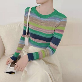 韩国早秋女装2022拼色彩虹条纹针织衫修身显瘦羊毛...