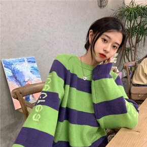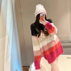 东大门条纹撞色针织冰淇淋宽松慵懒大版毛衣女秋冬外穿...