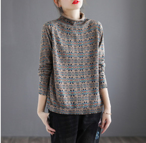 文艺复古加绒加厚半高领女新款印花宽松套头长袖卫衣打...