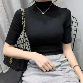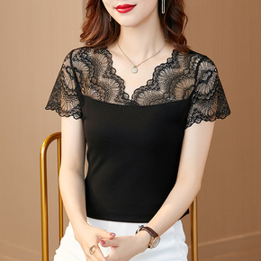 2022年新款修身百搭薄款蕾丝T恤女莫代尔短袖上衣...
