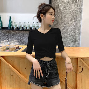 韩版修身显瘦上衣女2021年春夏新款双v领纯色t恤...