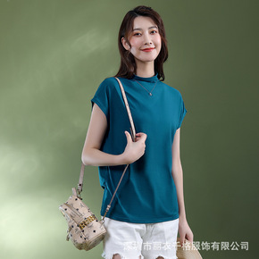新款莫代尔七分袖T恤女夏圆领木耳边短袖上衣大码百搭...