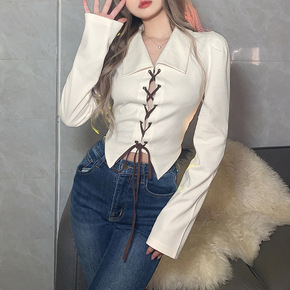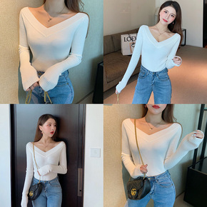 大双V领修身针织长袖白色露背显瘦女打底衫韩版202...