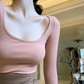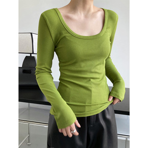 2022春季欧货内搭长袖t恤上衣显胸修身锁骨大U领...