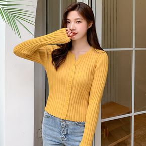 2022春季气质纽扣小V圆领长袖针织衫外穿短款开衫...