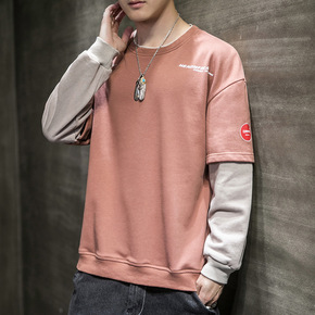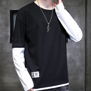 纯色套头假两件T恤男2022春季新款圆领撞色男士打...