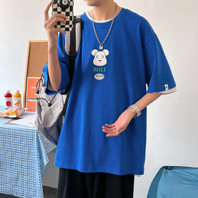 纯色套头假两件T恤男2022春季新款圆领撞色男士打...